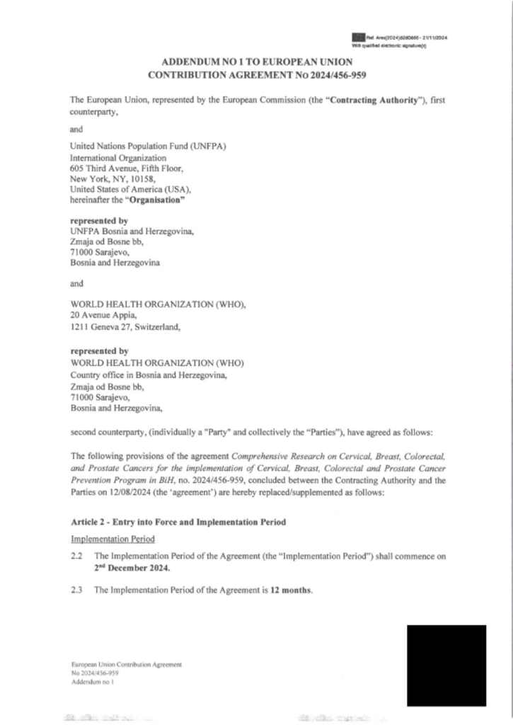 This is an Addendum No.1 to the agreement signed between the EU and UNFPA for the Joint Programme Comprehensive Research on Cervical, Breast, Colorectal, and Prostate Cancers for the implementation of Cervical, Breast, Colorectal and Prostate Cancer Prevention Program in BiH