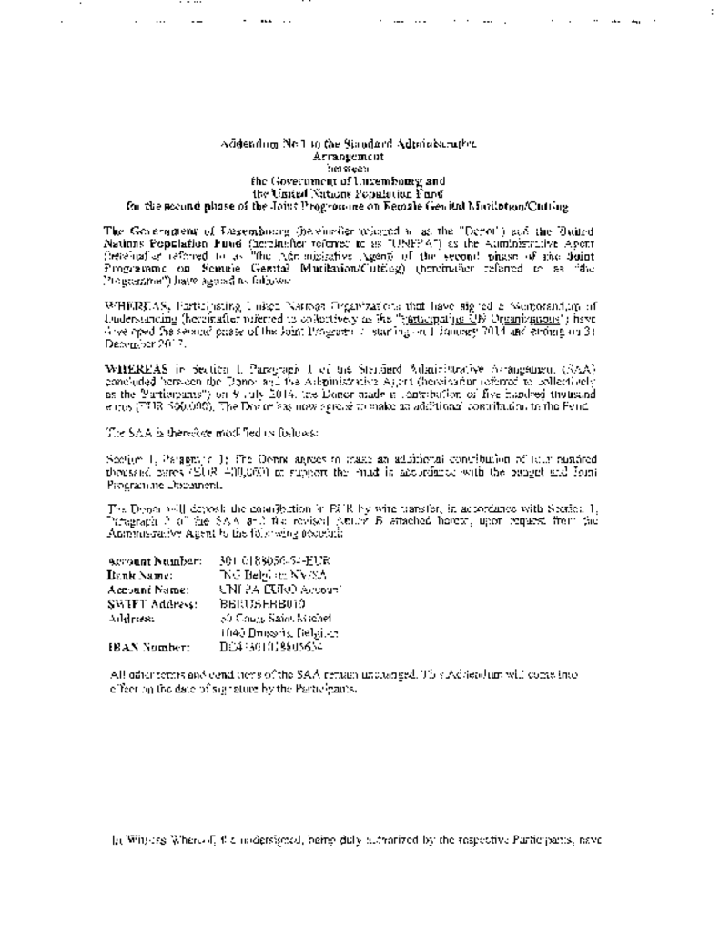 This is addendum no.1 to the Standard Administrative Arrangement Phase II agreement signed between UNFPA and the Government of Luxembourg for the Joint Programme on the Elimination of Female Genital Mutilation