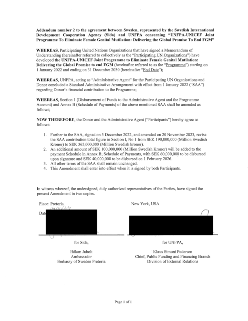 Addendum No. 2 to the SAA between UNFPA and the Government of Sweden for Phase IV of the Joint Programme on the Elimination of Female Genital Mutilation