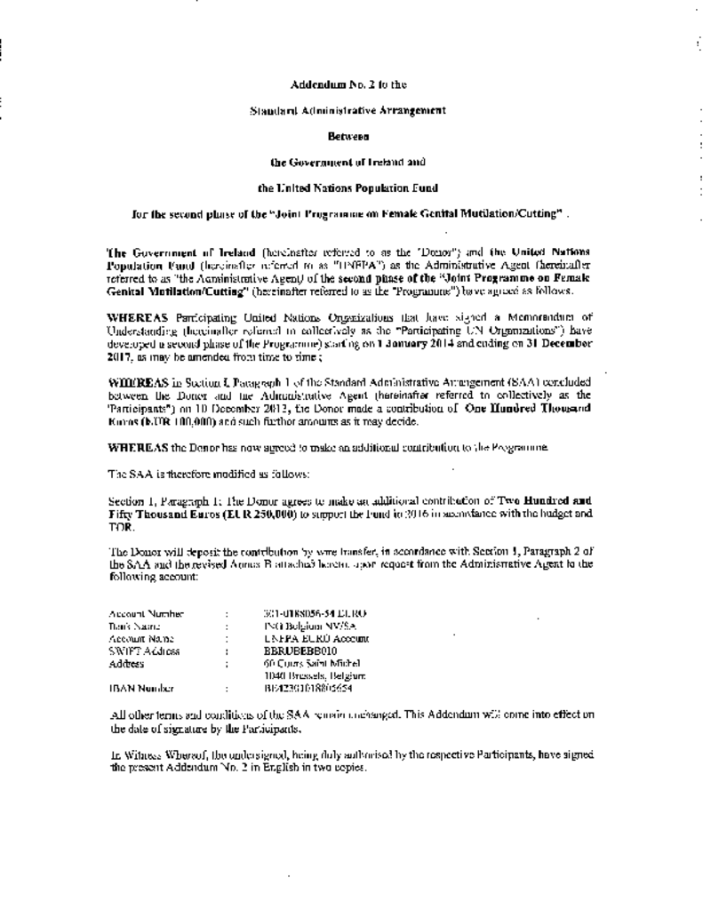 This is addendum no.2 to the Standard Administrative Arrangement Phase II agreement signed between UNFPA and the Government of Ireland for the Joint Programme on the Elimination of Female Genital Mutilation