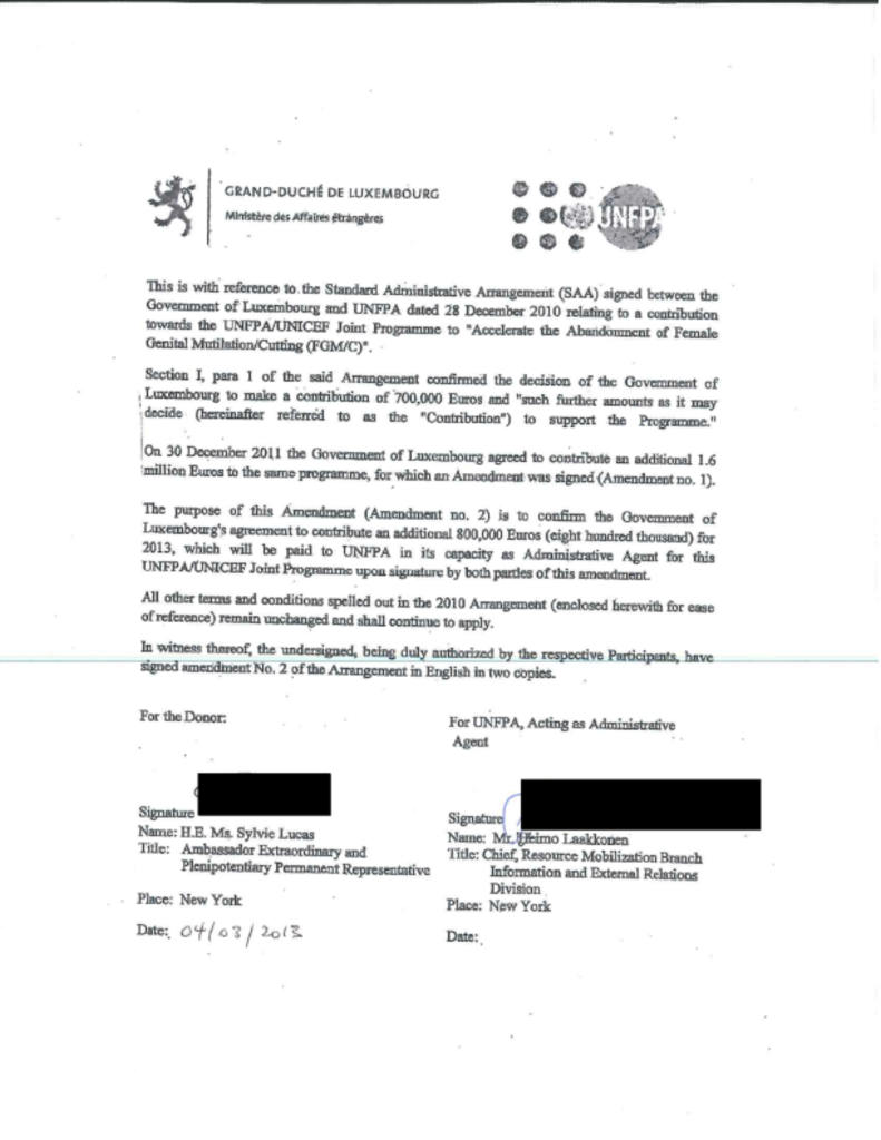Amendment No. 2 to the SAA signed between UNFPA and the Government of Luxembourg for Phase I of the Joint Programme on the Elimination of Female Genital Mutilation