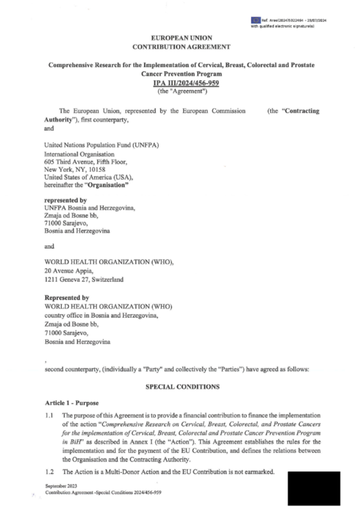 This is an agreement signed between the EU and UNFPA for the Joint Programme Comprehensive Research on Cervical, Breast, Colorectal, and Prostate Cancers for the implementation of Cervical, Breast, Colorectal and Prostate Cancer Prevention Program in BiH