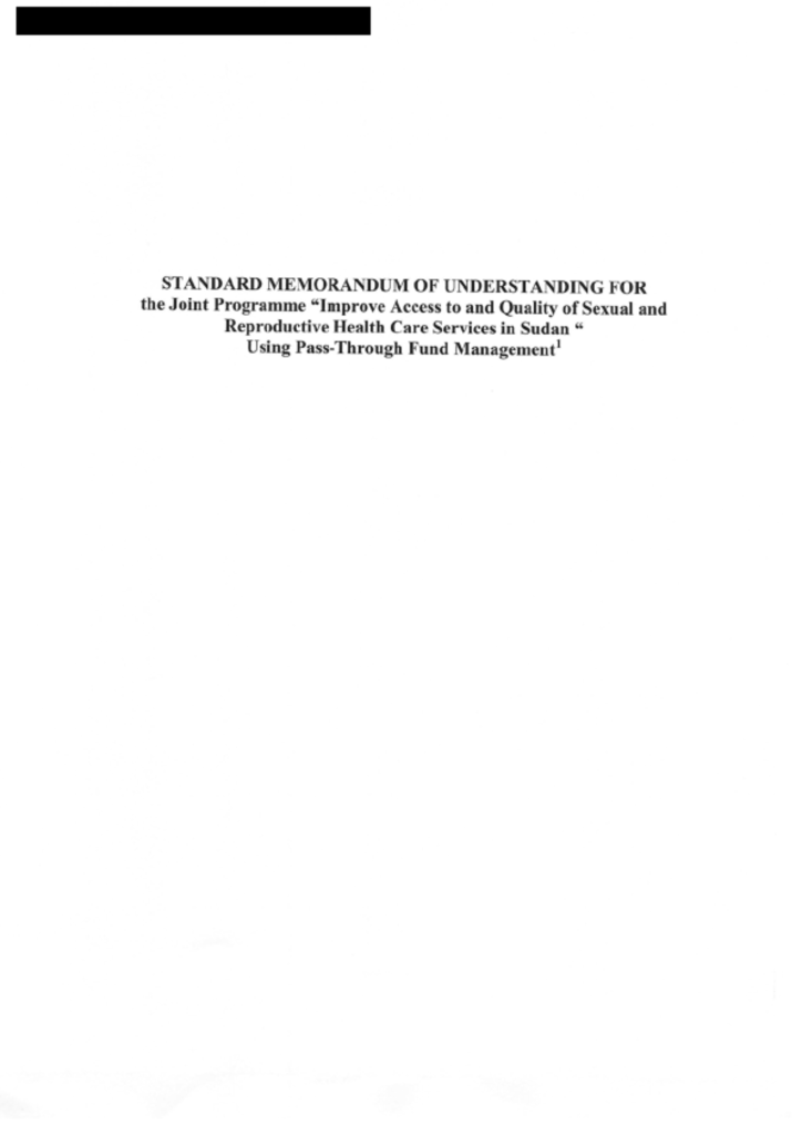 This is a Memorandum of Understanding signed between UNFPA and Partner UN Organizations for the Improved Access to and Quality of Sexual and Reproductive Health Care Services in Sudan Joint Programme
