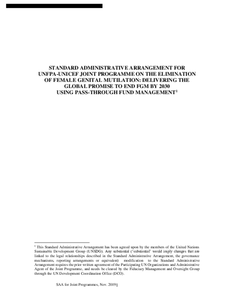 This is a Standard Administrative Arrangement signed between UNFPA and the Government of Belgium for the Joint Programme on the Elimination of Female Genital Mutilation Phase IV.