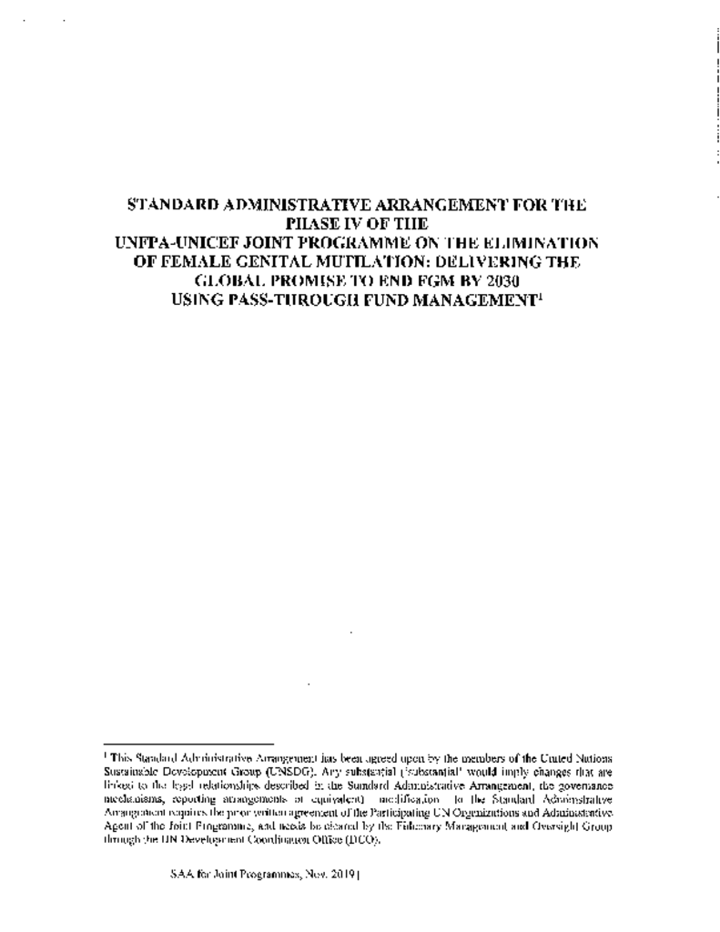 This is a Standard Administrative Arrangement signed between UNFPA and the Government of Luxembourg for the Joint Programme on the Elimination of Female Genital Mutilation Phase IV