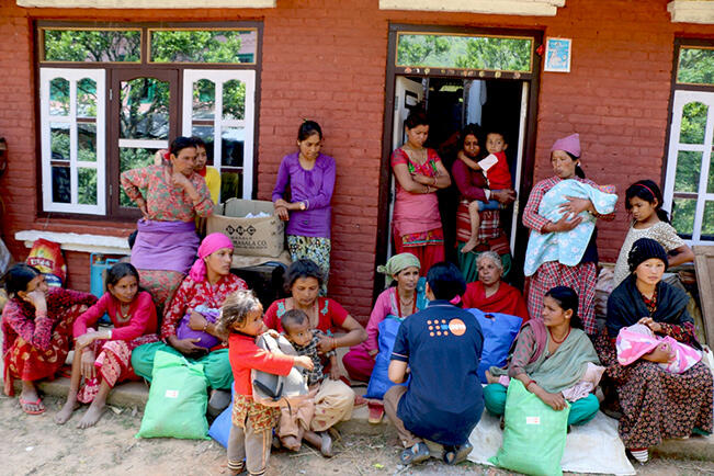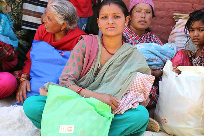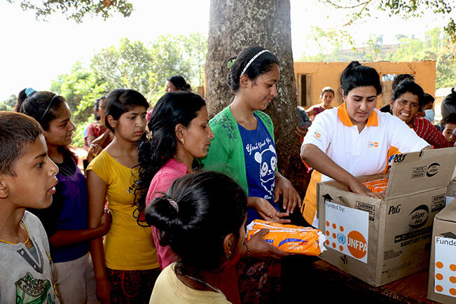 UNFPA is distributing hygiene materials for women and girls of reproductive age. Sajina Aryal (in green) says the materials are critically important. © UNFPA Nepal/Santosh Chhetri