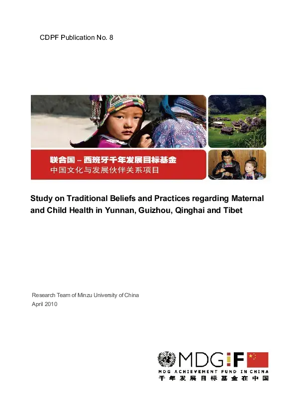The study was undertaken in the provinces of Guizhou, Yunnan, Qinghai and Tibet and considered the cultural beliefs and practices of selected representatives of six ethnic minority groups - Miao, Dong, Jingpo, Dai, Hui and Tibetans - in relation to key aspects of maternal and child health. It was designed to identify enabling factors that contribute to the uptake of MCH services, as well as any harmful traditional practices or other barriers that impede maternal and child health and utilization of related services. Information was gathered in relation to religious and traditional beliefs and practices in general, as well as attitudes, beliefs and practices in relation to health and nutrition of pregnant women and children. The research team was tasked to identify and highlight specific practices, beliefs or attitudes – from either demand or supply side - which could be targeted in MCH guidelines, policy and service delivery, in order to enhance access to and utilization of MCH services, thus contributing to improved health targets.